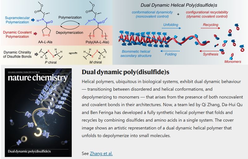 近日,我校化学与分子工程学院费林加诺贝尔奖科学家联合研究中心(以下简称诺奖中心)研究人员张琦、曲大辉、费林加在动态聚合物方面取得研究进展。相关研究成果以“Dual Dynamic Helical Poly(disulfide)s with Conformational Adaptivity and Configurational Recyclability”为题在线发表于《自然·化学》(Nat. Chem. 2025, 17, 1462–1468),并入选当期封面。